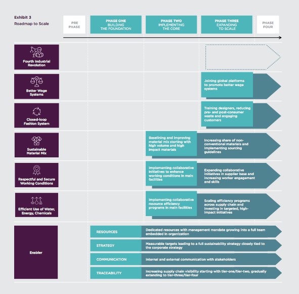 (上圖)時尚業首次嘗試為品牌和零售商規劃對永續發展的步驟圖,此路線圖分為三個階段: